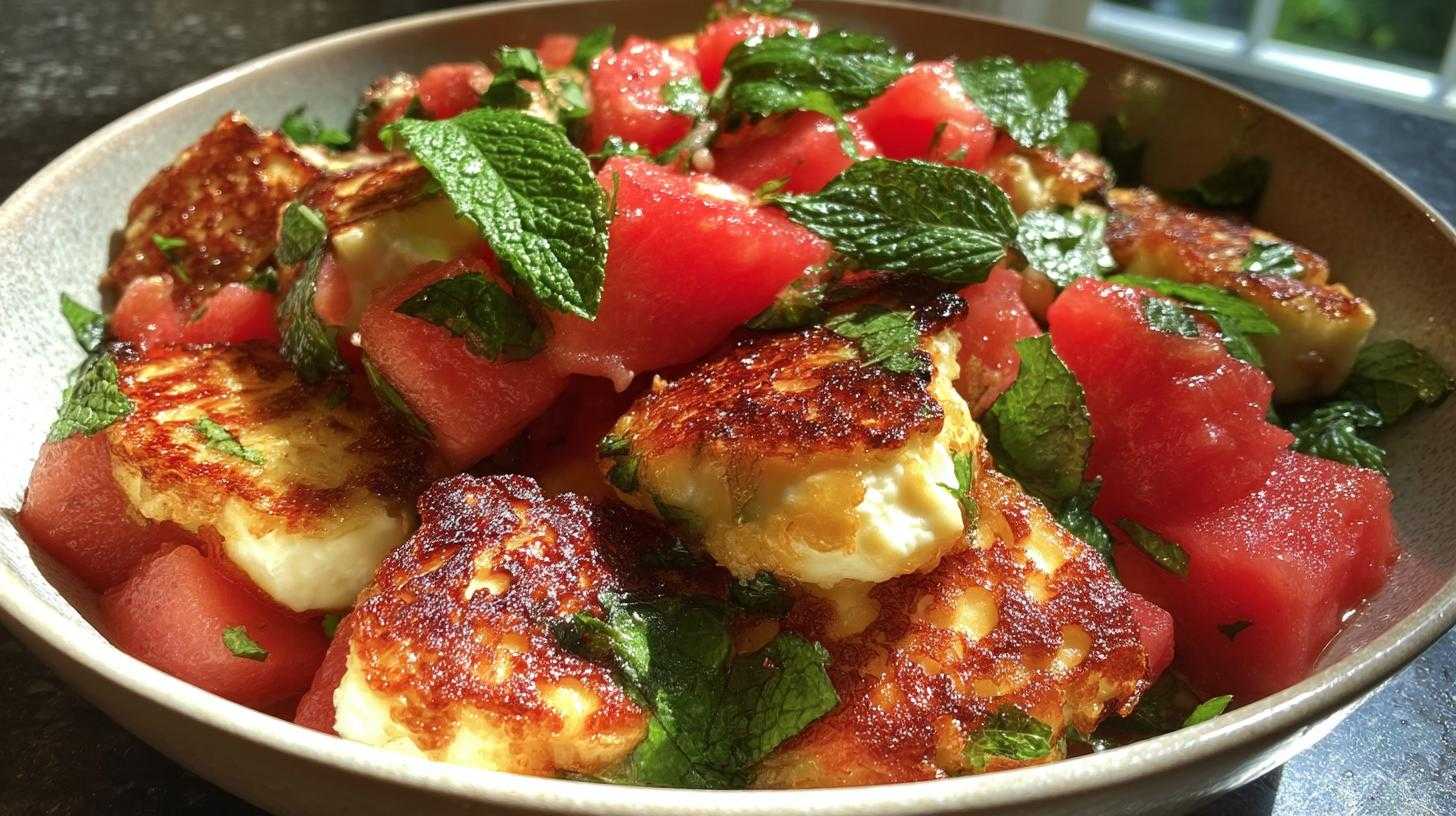 A refreshing salad featuring salty grilled halloumi, sweet watermelon, and fresh mint.